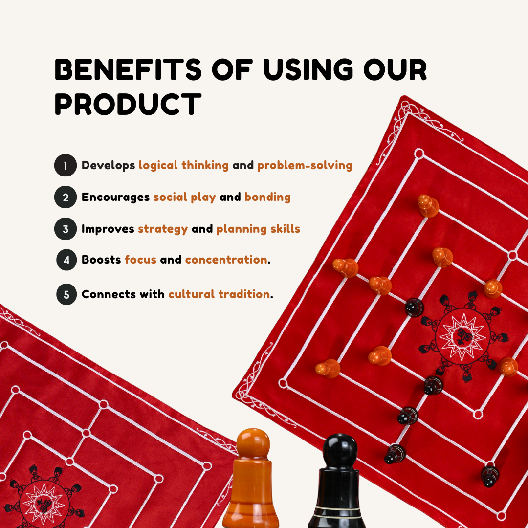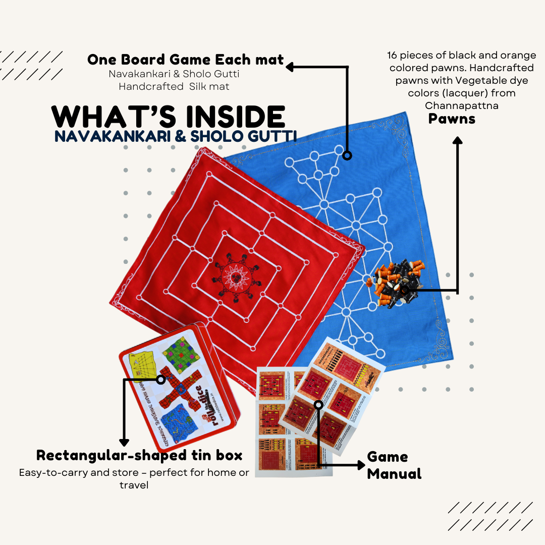 - Includes Two Game Mats – One for Navakankari and one for Sholo Gutti