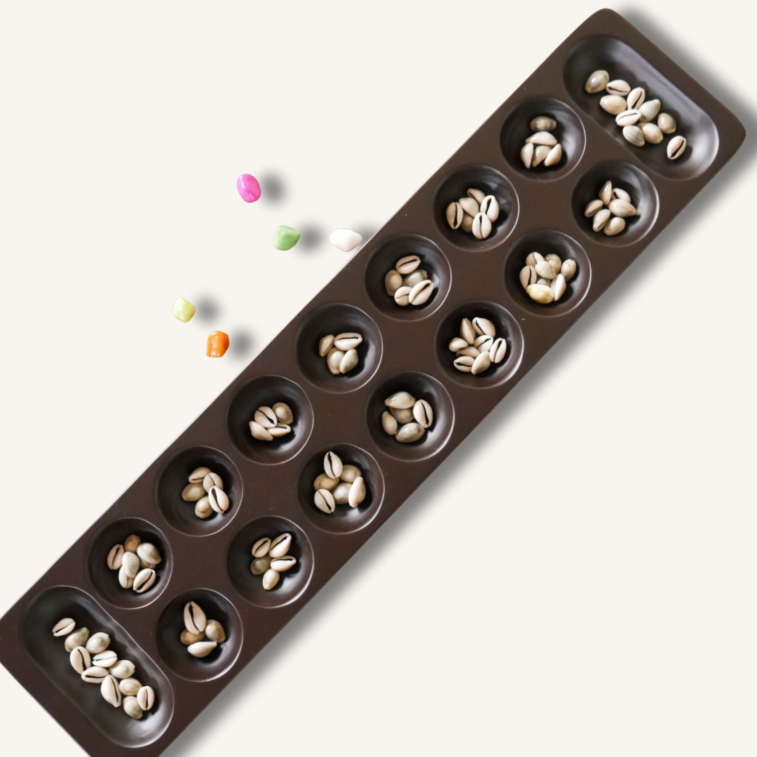 The game is a two-player strategy game traditionally played with shells, seeds, or small stones. It has simple rules yet requires thoughtful planning, making it both relaxing and intellectually stimulating.
