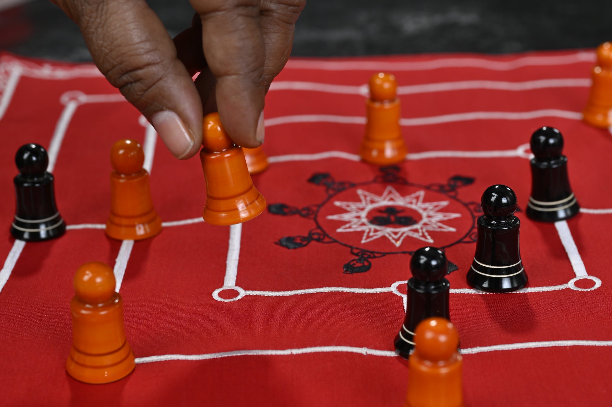 Daadi, also known as Nine Men's Morris, is a game of strategy. It is played on a simple grid board with three concentric squares. The goal of the game is to get three of your pieces in a row, either horizontally, vertically, or diagonally. Players take turns placing their pieces and moving them to adjacent spaces, trying to block their opponent's progress and create opportunities for themselves.