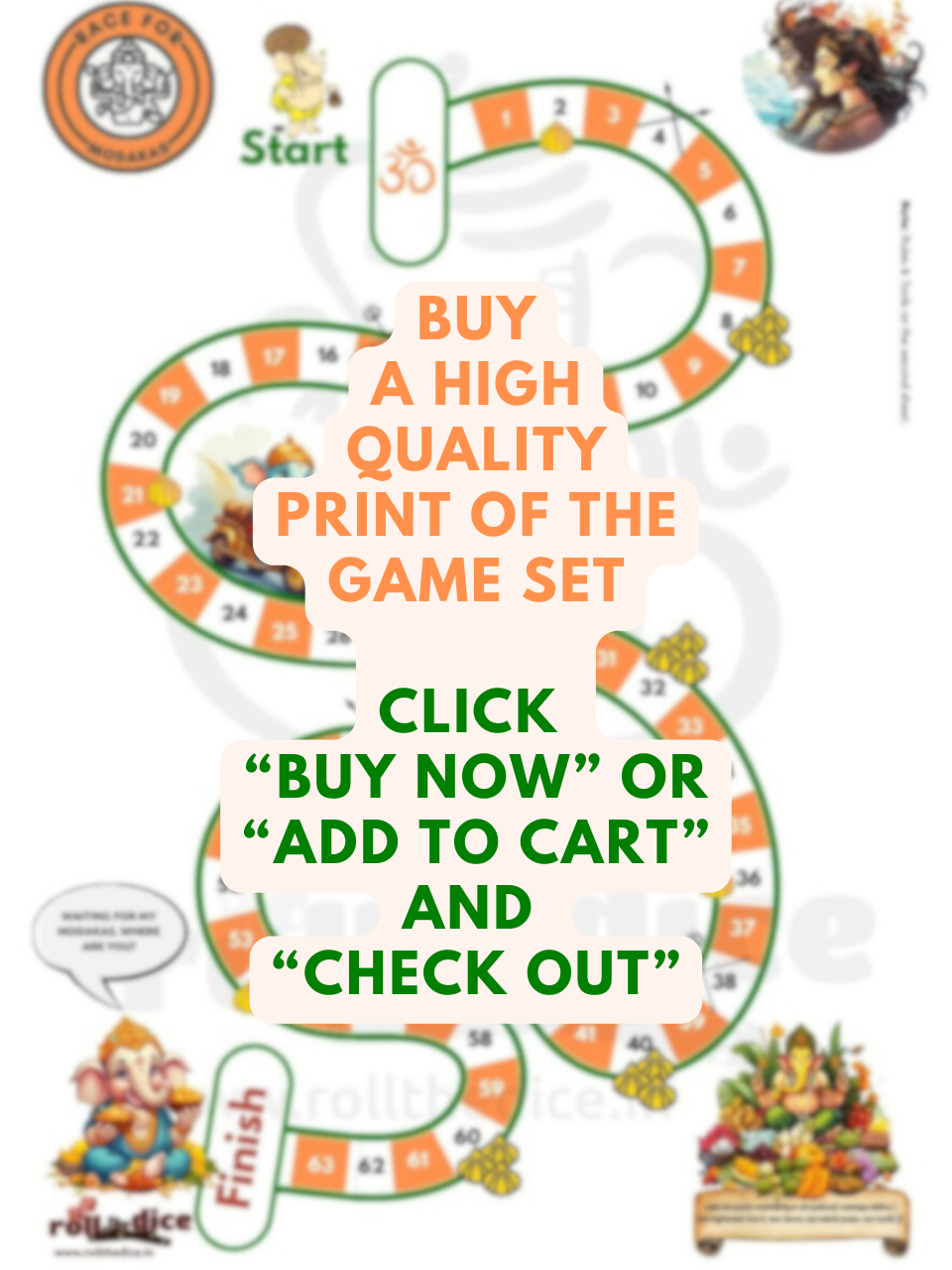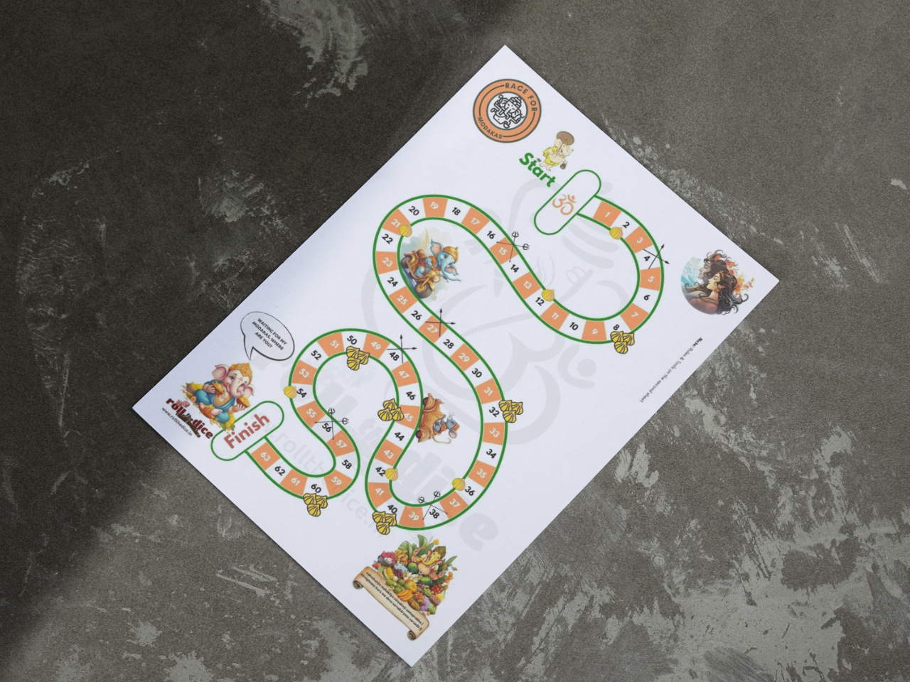 Dive into the captivating world of Hindu Puranas with "Race for Modakas," a board game that seamlessly blends fun, education, and spirituality. Navigate celestial challenges, answer trivia questions, and collect divine modaks (sweet dumplings) as you make your way from the start to the finish line.